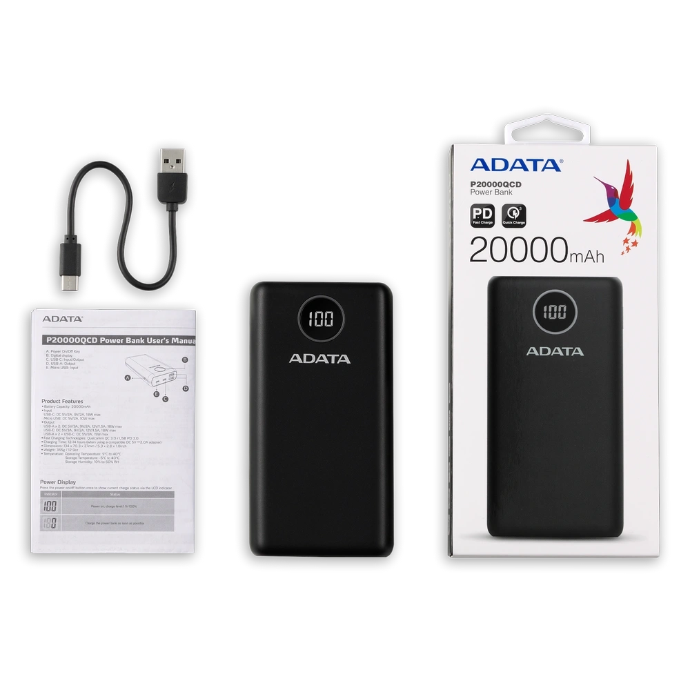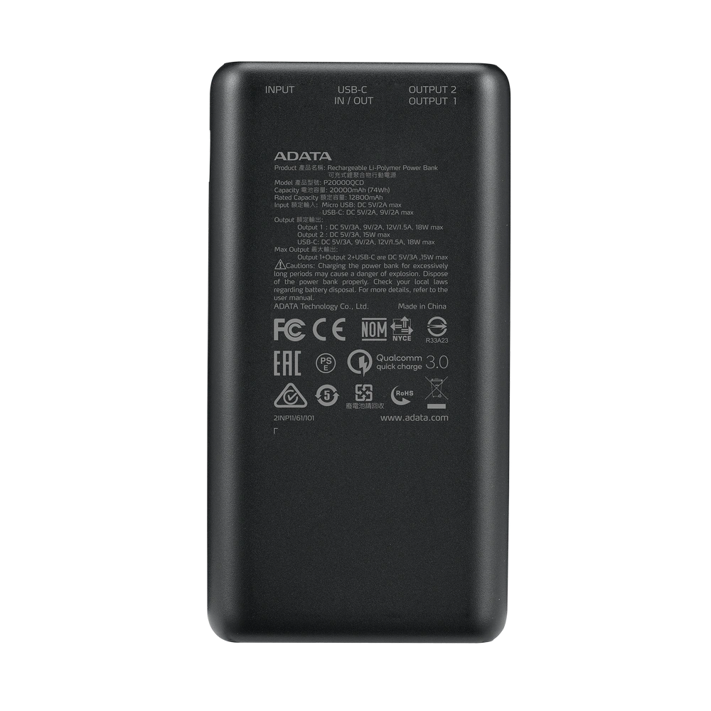 Cut down on the wait with the ADATA P20000QCD power bank! Featuring a large 20,000mAh battery, compact form factor, and support for Qualcomm QC 3.0 and USB Power Delivery 3.0, the P20000QCD will charge up your devices in no time as you go!